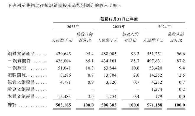 目前铜师傅共有四大类产品,分别为铜质文创产品、塑料手办潮玩,以及金银材质的文创产品。其中,铜质产品是公司营收的主要来源。2022年、2023年、2024年及2025年前9个月,铜质文创产品收入分别为4.8亿元、4.88亿元、5.51亿元及4.25亿元,分别占同期总收入的95.4%、96.3%、96.6%及94.8%,其中铜质摆件收入占比超过85%,产品结构十分集中。