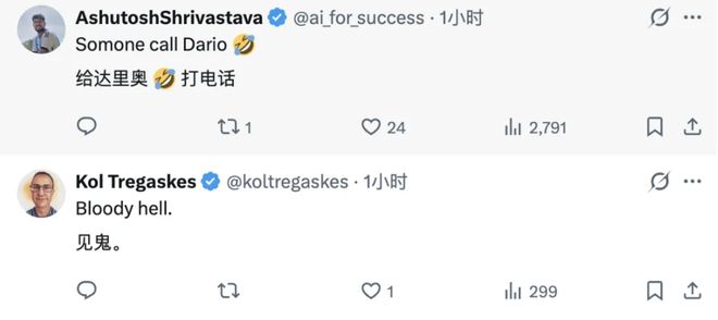 评论区瞬间热闹起来,用户 @ai_for_success 只说了一句:「快给 Dario 打电话!」(Dario Amodei 是 Anthropic 的 CEO);