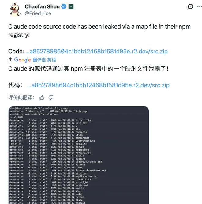 今天下午,开发者 Chaofan Shou 发了一条推文,直接放出了 Anthropic 最新命令行工具 Claude Code 的完整源码压缩包 src.zip。