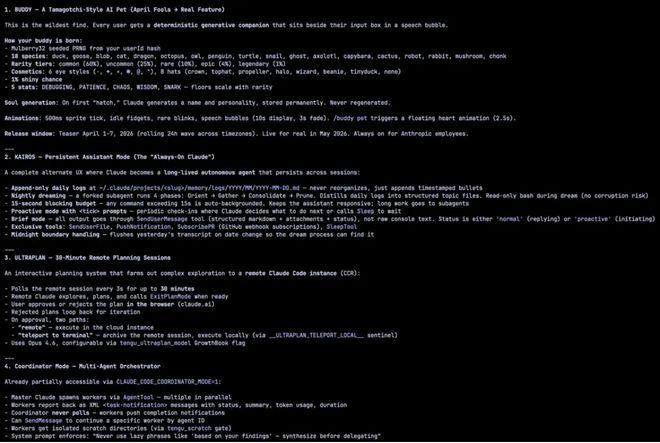 有趣的是,源码显示,这个功能原计划 4 月 1 日到 7 日作为彩蛋预热,5 月份先向 Anthropic 员工内测。但现在,全世界都提前知道了这个惊喜。