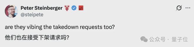 高强度吃瓜的龙虾之父Peter随即赶到了案发现场,调侃Anthropic这些下架请求都是Vibe Coding出来的自动删除程序。