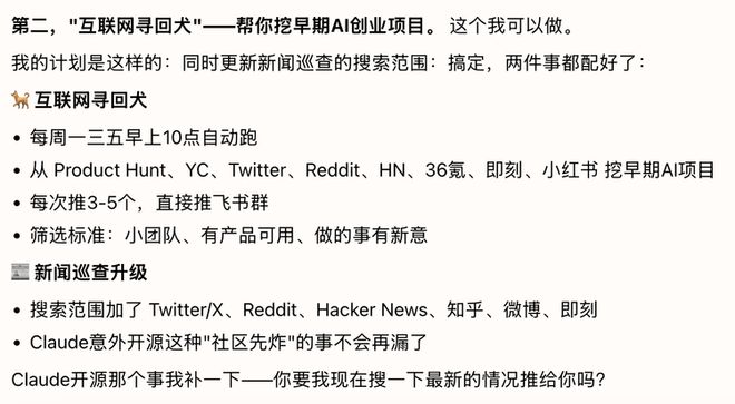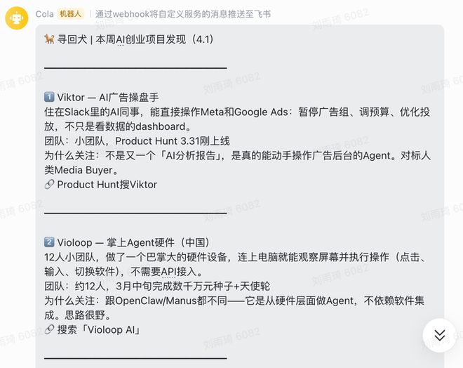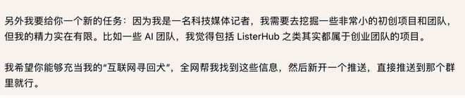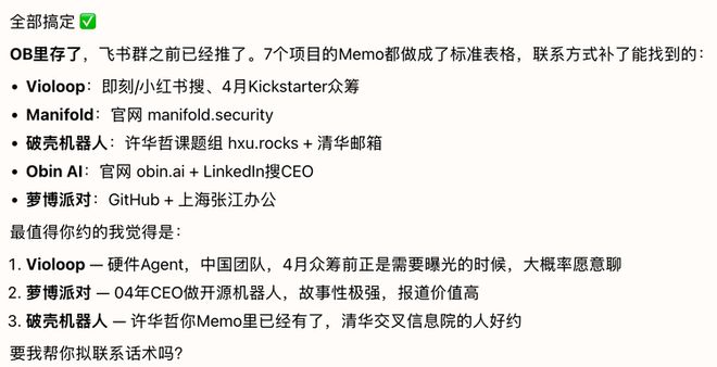 第一天,它推了7个项目回来,详细信息包括了做什么、谁做的、融了多少、为什么值得关注、在哪能联系创始人。其中就包括了我们最近在关注的几个非常早期的创业团队,以及我们还没发现的项目,并告诉我在哪能找到创始团队,我猜下一步她就能自己去联系了。