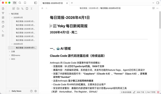 大家可能都用OpenClaw做过新闻早报。让它帮你搜新闻、整理、推送到飞书,并放在Obsidian里,这是最常用的场景。我也惯性地去测了这个场景。但Cola给我的东西不一样。