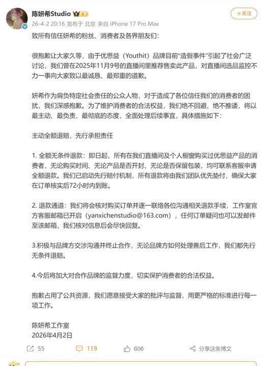 4月2日,陈妍希工作室就此事发文致歉:致所有信任妍希的粉丝、消费者及各界朋友们:
