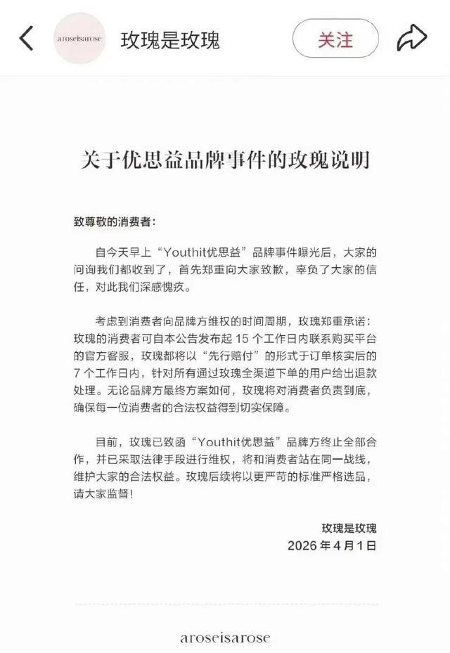 同日,章小蕙通过其公司账号“玫瑰是玫瑰”发布正式声明致歉。声明表示,自1日早上“YouthIt优思益”品牌事件曝光后,首先郑重向大家致歉,辜负了大家信任,对此我们深感愧疚。