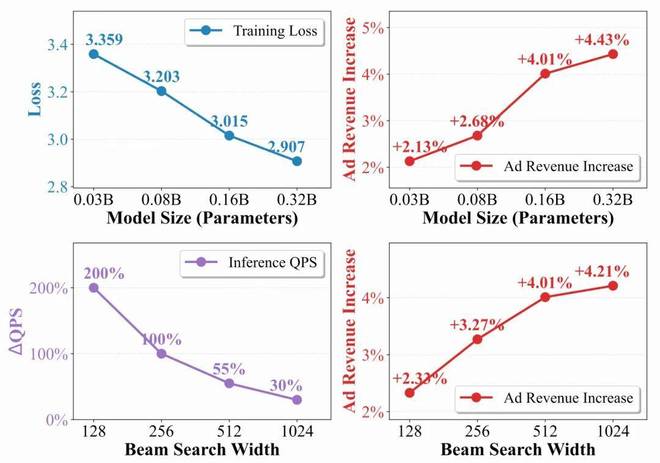 模型规模方向:从 0.03B 到 0.32B,收入提升从 + 2.13% 单调增长到 + 4.43%,训练损失也持续下降。生成式广告推荐的 Scaling Law 是成立的