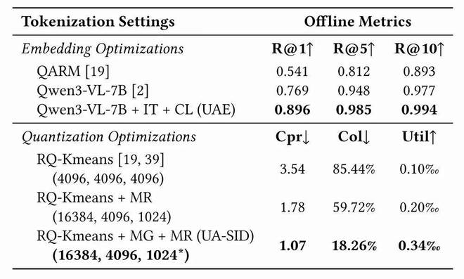 在嵌入质量评估(photo-to-photo recall)中,经过指令微调和共现学习的 UAE 达到了 R@1=0.896,远超基线 QARM(0.541)和原始 Qwen3-VL-7B(0.769)。MGMR 量化将 SID 碰撞率从 85.44% 降至 18.26%,码本利用率提升 3 倍以上。