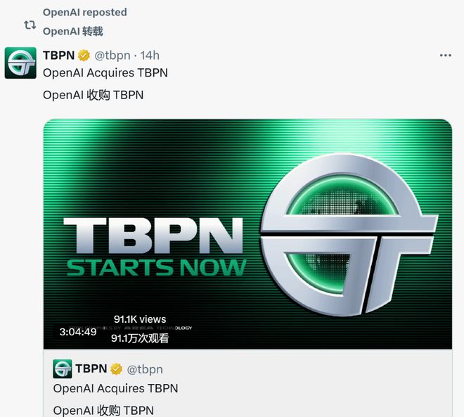▲OpenAI转载收购TBPN的声明(图源:X)