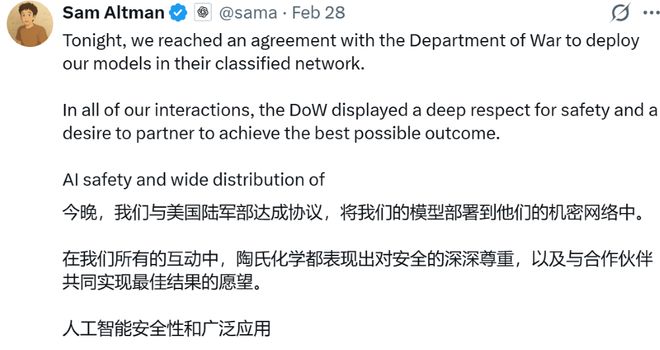 ▲阿尔特曼发布与美国国防部的协议声明(图源:X)