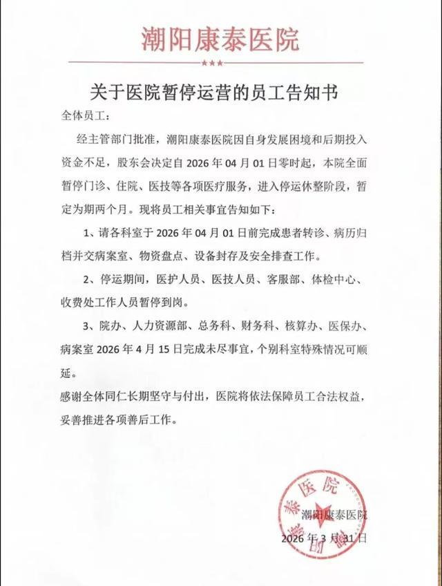 华商报大风新闻记者关注到,该院于2026年3月31日发布员工告知书,称因自身发展困境和后期投入资金不足,经主管部门批准,股东会决定自2026年4月1日零时起,该院全面暂停门诊、住院、医技等各项医疗服务,进入停运休整阶段,暂定为期两个月。4月1日,该院公众号发公告称,因医院相关运营调整需要,康泰医院即日起暂停所有医疗诊疗服务,包括门诊、急诊、住院、体检等全部业务,恢复营业时间将另行通知。