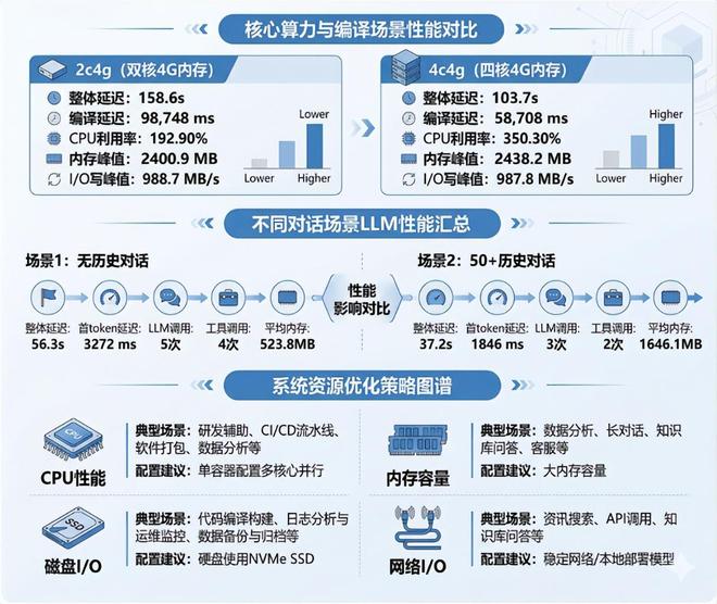 研发编译场景优化:针对开发者关注的高负载代码编译场景,现场展示了一组极具冲击力的对比数据。实测显示,将CPU核心从2核翻倍至4核,任务时间可缩短34.6%。由于编译伴随大量中间文件产生,IO写峰值可达1GB/s,因此必须选配NVMe SSD以消除IO瓶颈;