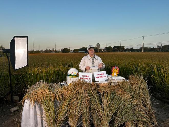 浦江新农人、美食博主珑妈在稻田里直播。