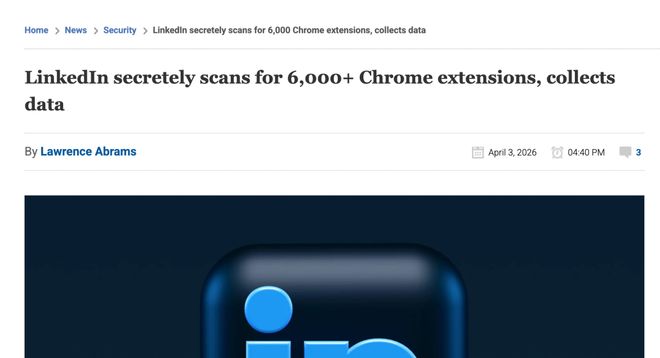 【环球网科技综合报道】4月4日,据海外科技媒体BleepingComputer 报道,一份名为“浏览器门”(BrowserGate)的最新报告指出,微软旗下的职场社交平台领英(LinkedIn)会在其网站中植入隐藏的 JavaScript 脚本,扫描访问者的浏览器,检测已安装的扩展程序,并收集设备数据。