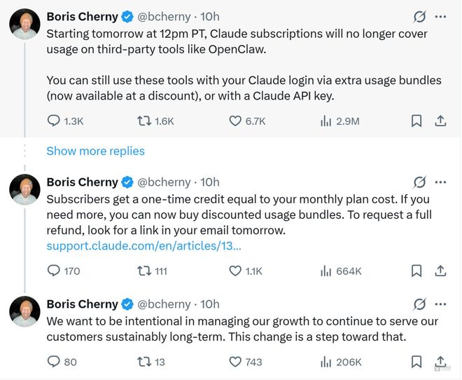 消息由Anthropic旗下Claude Code负责人Boris Cherny在X平台首发,四条连续推文宣告了这一政策转向的全貌:容量压力、资源管理、一次性补偿、退款通道——官方的表述滴水不漏,但业内对这一决策的背景早有预判。