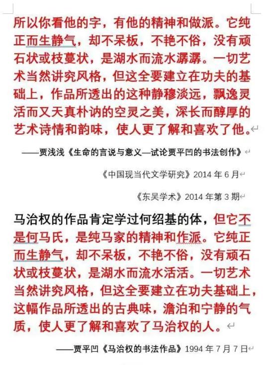 另一篇论文(《生命的言说与意义——试论贾平凹的书法创作》)又被扒出部分段落照搬其父旧作(《马治权的书法作品》),还堂而皇之列入了个人核心学术成果,甚至入选高校青年科技基金项目。