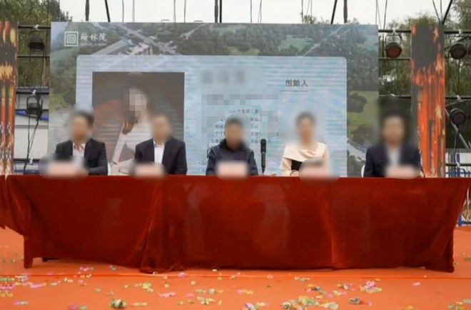 而雷女士本以为签了新协议,盖完楼可迅速出售回笼资金,为此还将该项目名称改为“翰林院”,并在两栋楼施工封顶后举行了仪式。在现场视频中,记者注意到任某平位于合影的中心位置。