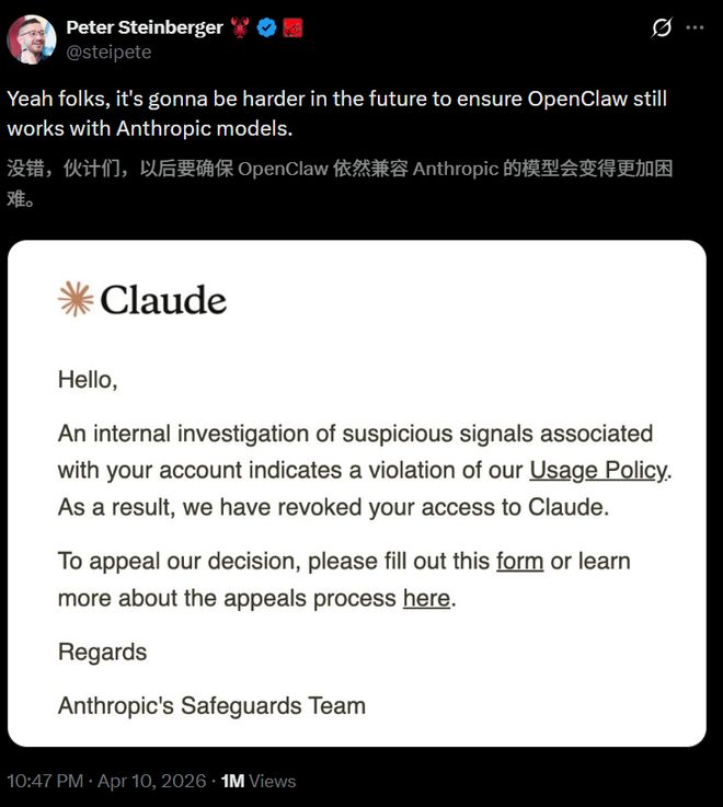 就在刚刚,OpenClaw作者Peter Steinberger在X上晒出一张来自Anthropic的封号邮件。
