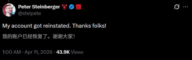 4月10日,Steinberger账号被封,两个多小时后恢复。