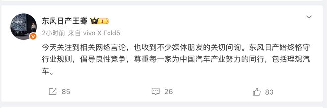 李想发文不久后,东风日产汽车销售有限公司新能源品牌总经理王骞通过官方认证账号发文称,“今天关注到相关网络言论,也收到不少媒体朋友的关切问询。东风日产始终恪守行业规则,倡导良性竞争,尊重每一家为中国汽车产业努力的同行,包括理想汽车。”