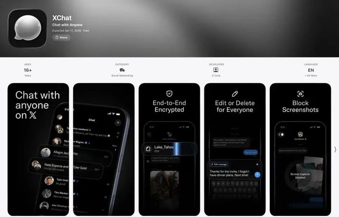 近期,马斯克的X版微信XChat正式上线App Store,并将于4月17日正式推出。