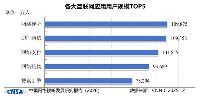 报告显示,截至2025年12月,在网民使用率80%以上的主要网络应用中,网络支付、网络购物、即时通信等应用的用户规模或使用率均有下降,短视频是唯一一个用户规模和使用率“双增长”的细分应用。