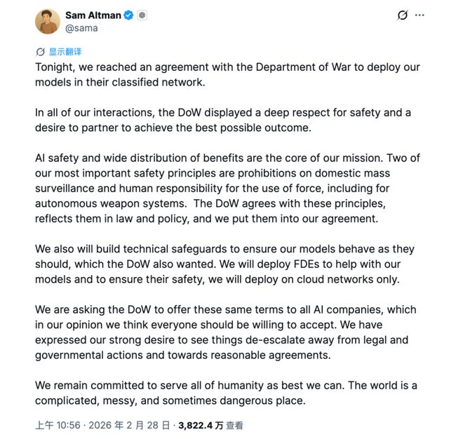 Sam altman 宣布 OpenAI 与美国国防部达成合作