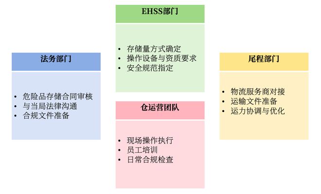 一个特殊品类仓从建仓到运营,共涉及法务部门、EHSS(合规和风险控制)部门、尾程部门及仓运营团队四个团队进行协作。
