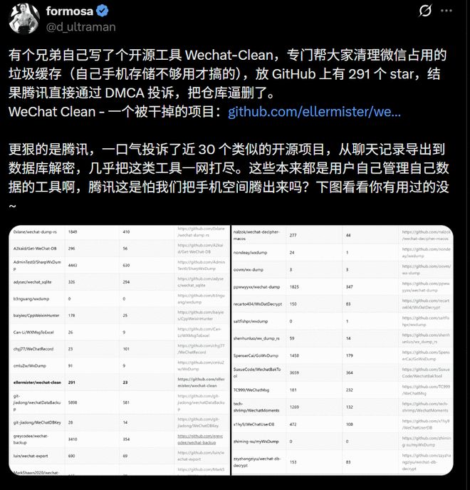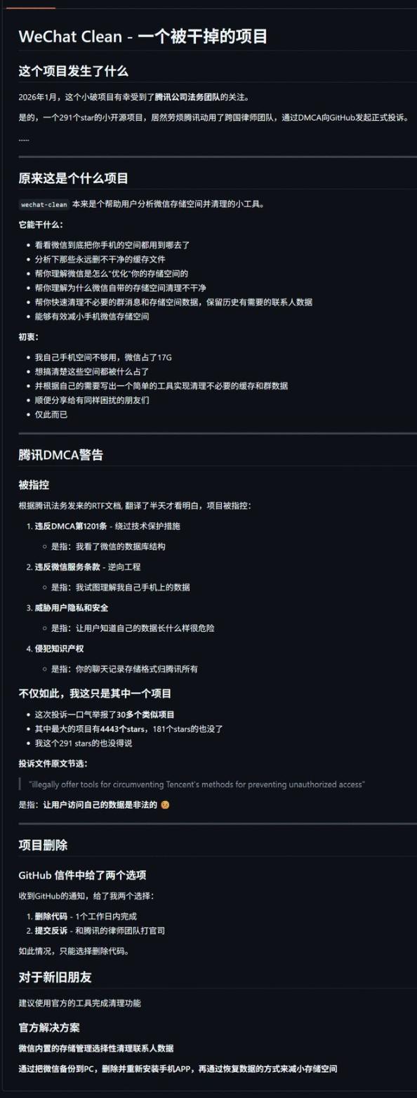 近日,有消息称,腾讯已正式向 GitHub 发出 DMCA 投诉函,要求平台下架一批“允许用户导出或分析自己微信聊天记录”的开源项目。 其中,较受关注的项目之一 WeChat Clean,其维护者已公... 全文