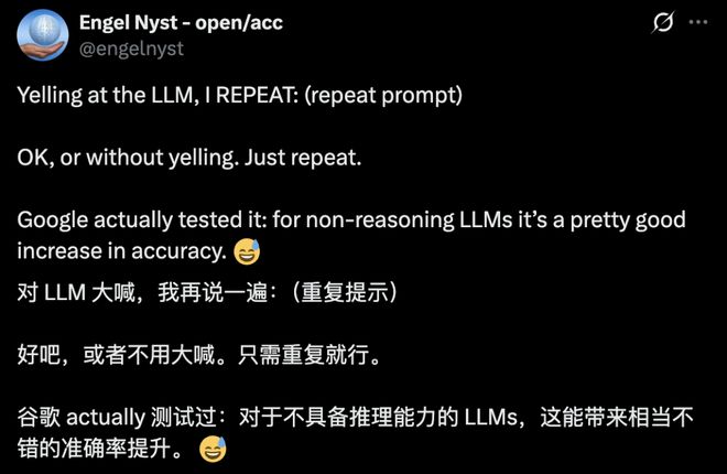 据“新智元”,Google Research的一项新研究揭示了一个简单却极其有效的提示词技巧:通过将问题复制粘贴再说一遍,可显著提升大模型在非推理任务上的准确率。在实验中,Gemini、GPT-4o、... 全文