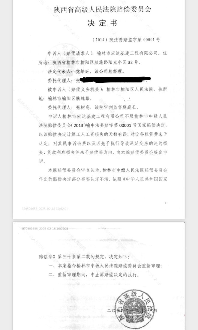 此后,宏达公司向陕西高院赔偿委员会申诉。2014年12月,陕西高院赔偿委员会审查后认为,榆林中院赔偿委员会作出的赔偿决定部分事实认定不清,决定指令榆林中院赔偿委员会重新审理。