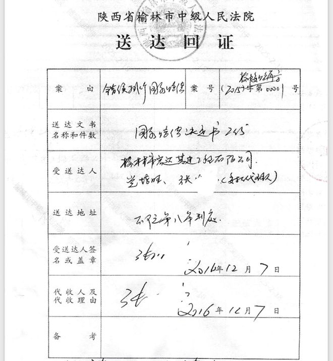 案卷材料显示,陕西高院将上述国家赔偿案指令重审后,榆林中院于2015年8月27日曾举行听证,曾任宏达公司代理律师的张某某于2015年8月24日在听证传票送达回证上签字代收。