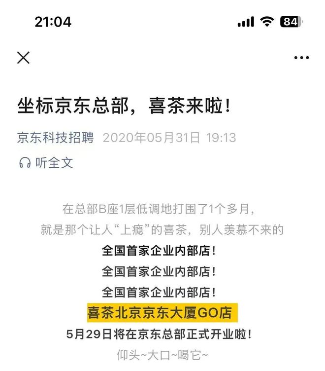 公开资料显示,喜茶京东总部门店开业于 2020 年 5 月,京东当时特别对外强调,这是喜茶"全国首家企业内部店"。除了喜茶,京东总部大楼还接连引入了包括星巴克、COSTA、MUJI、单向空间等诸多品牌。
