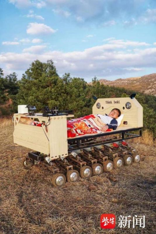 顾玉鹏告诉记者,“床车”原本是他小时候因起床困难而幻想出来的物件,如今已经从最初的“懒人床”,演变成了“4.0版本多功能硬核床”——装有多轮、履带、机械臂,能爬楼、越野、水陆两栖。目前,他的“自制床车”系列视频累计播放量已经超过1600万,被网友调侃道:“造床的和造车的看到都惊呆了!”