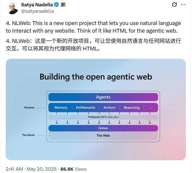 微软 CEO Satya Nadella 表示:「NLWeb 允许用户使用自然语言与任何网站进行交互。我们可以把它想象成智能体化 web 世界的 HTML。」