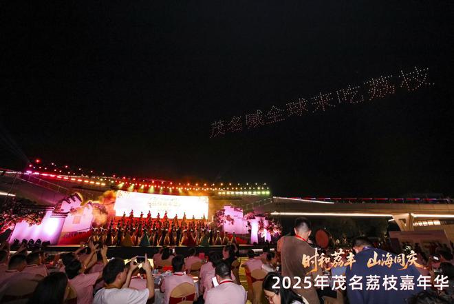 5月19日,2025年茂名荔枝嘉年华“美荔之夜”现场上空,无人机排出“茂名喊全球来吃荔枝”的图案。 澎湃新闻记者 王岱玉 图