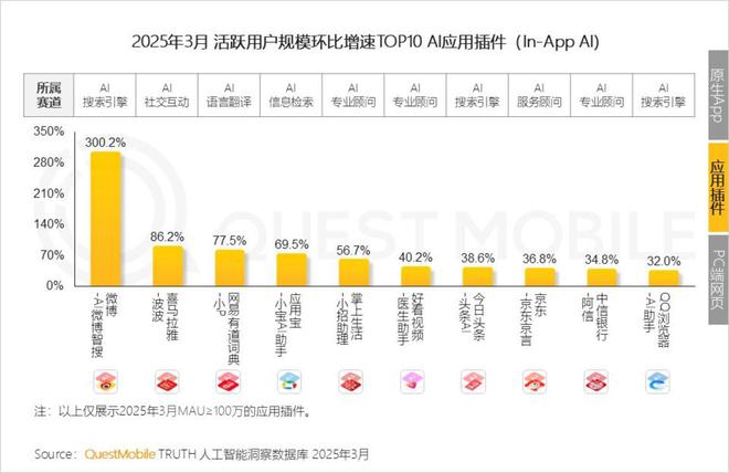 一季度有两个时间节点见证了这款产品的声量增长。一是 2 月接入 DeepSeek-R1 大模型,借其热度正盛之时打出了自己的招牌;二是 3 月用户规模激增,QuestMoblie 发布的《2025 全域 AI 应用市场报告》显示,3 月微博智搜月活跃用户(MAU)环比增长 300%,成为 AI 应用插件领域增长最快的产品。