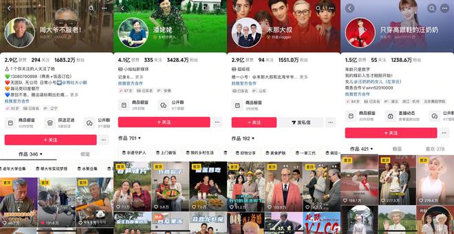抖音头部博主里,定位“时尚生活方式”的包括账号“康康和爷爷”、“只穿高跟鞋的汪奶奶”、“末那大叔(北海爷爷)”等,粉丝量已分别达600万、1200万与1500万;定位“高自律生活习惯”的代表账号则有“周大爷不服老”,粉丝量达1600万;定位“悠闲乡村生活”的则有“我是田姥姥”、“潘姥姥”等,粉丝量均超3400万。