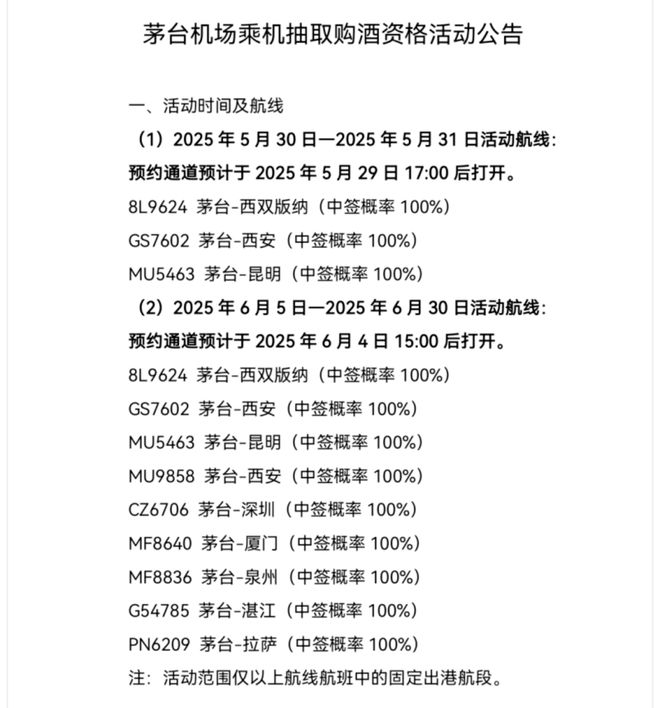此前5月29日,遵义茅台机场发文称,在上述日期乘坐指定航线航班的旅客可参与抽取购酒资格,中签后可按1499元官方指导价预约购买53度飞天茅台1瓶,且中签率高达100%。(时代财经 林心林)