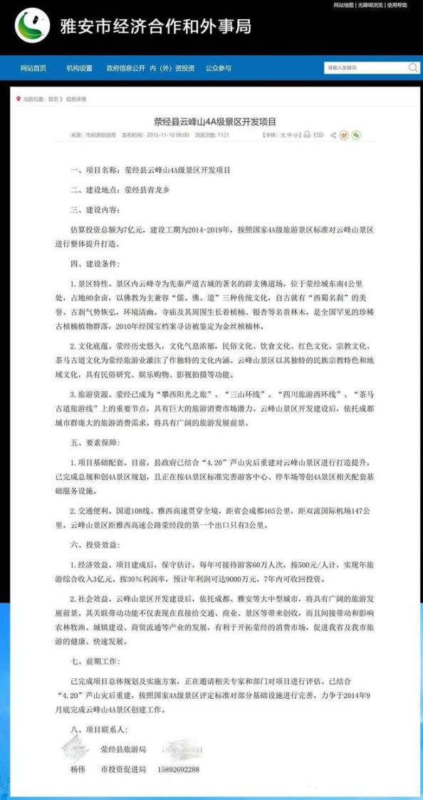 有网友晒出一份《荥经县云峰山4A级景区开发项目》的文件,里面标明的项目联系人为杨伟,电话也与上述公司关联的一致。该项目估算投资总额为7亿元,建设工期为2014—2019年。该项目的要素保障中提到:目前,县政府已结合“4.20”芦山灾后重建对云峰山景区进行打造提升,已完成总规和创4A景区规划,且正在按4A景区标准完善游客中心、停车场等创4A景区相关配套基础服务设施。