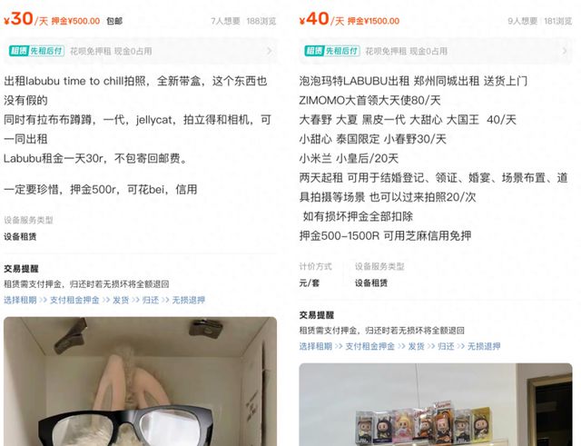 一名出租卖家向记者表示:“LABUBU作为近期大火潮玩单品,适合拍照出片,租客多为准备聚会或拍摄社交平台照片、短视频等,相比高价费心购买,租赁能降低尝鲜成本。”