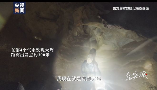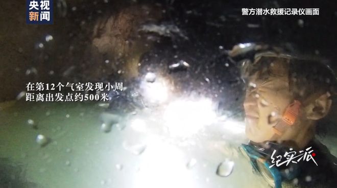 2月6日04:30,失联9.5小时后,搜救人员在第4个气室发现大周,距离出发点约300米。大周为了不失温,把潜水装备拆下来卡在石缝,人坐在上面。