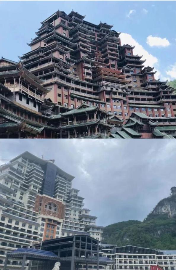 在施工现场可以看到,通过改造,水司楼原先的外立面已发生巨变,悬空的亭台楼阁不见踪影,标志性的外挂木结构和满墙的琉璃件已分别被钢筋混凝土和玻璃幕墙替换。这座集合了水族、布依族等少数民族元素的水司楼,即将被改造为豪华的现代化酒店。建筑物旁矗立的标牌显示,投入运营后,其将以“紫林山豪利维拉酒店”的新面孔示人。