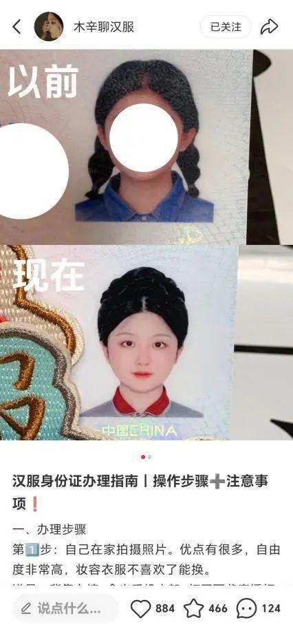 也有热心网友在林梓妍的社交平台评论区提醒,不是所有汉服都符合身份证照要求,如宋制的对襟衫就不能作为身份证照的着装。