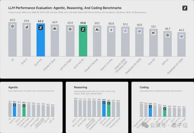 评测结果显示,GLM-4.5的综合平均分全球范围内第三(仅次于闭源的o3、Grok4),而在开源和国产两个维度均取得第一的成绩!