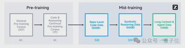 在预训练阶段,模型首先在15T的通用预训练语料上进行训练,随后在 7T 的代码与推理相关语料上继续训练。在完成基础预训练后,团队又引入了若干额外阶段,以进一步提升模型在关键下游任务中的表现。