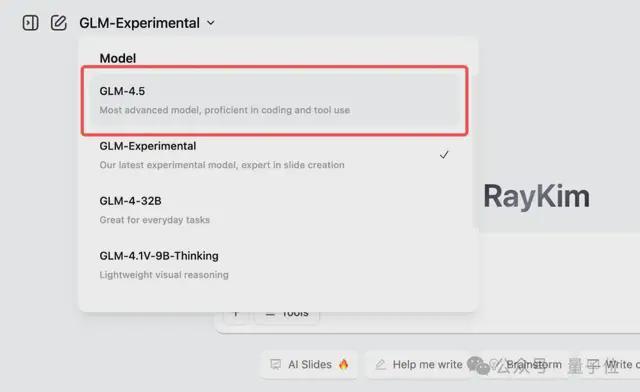 例如在Z.ai上,我们只需在模型下拉菜单中选择“GLM-4.5”即可: