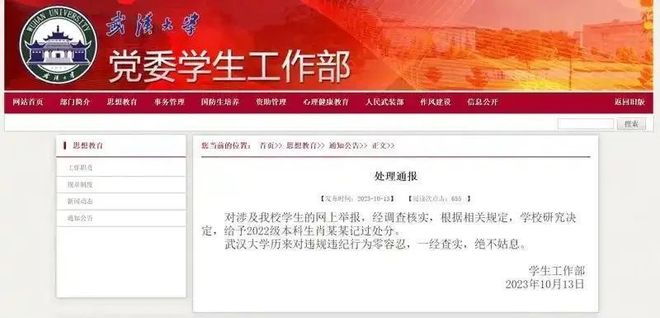 该女生发文维权两天后,武大发布通报给予肖某某记过处分,认定“肖某某在图书馆北门走廊存在不雅行为”。
