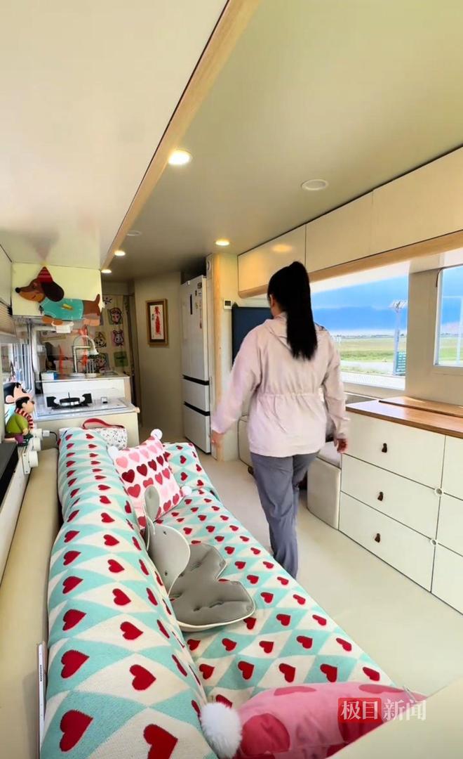 梁女士称,买房车的另一个原因是广东那边房价比较高,所以就选择在2023年花费20多万买了一辆二手大巴车改造成了房车,这辆车内有24平方米的空间,两室一厅一厨一卫,有生活所需要的各种家具和电器,有太阳能板,日常用电也比较方便。梁女士告诉记者,在这两年时间里,他们一家生活成本相较于住在楼房里会更低一些,也住得很舒服。“目前,我主要工作就是做自媒体,也更自由一些。”