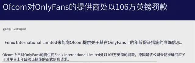就在今年3月份,OnlyFans便由于未能提供准确的年龄验证讯息,被英国监管机构罚了105万英镑,而这仅仅是一个开始。