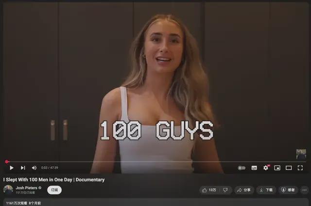 (图注:莉莉后续百人斩纪录访谈在油管上播放量已经突破1100万)
